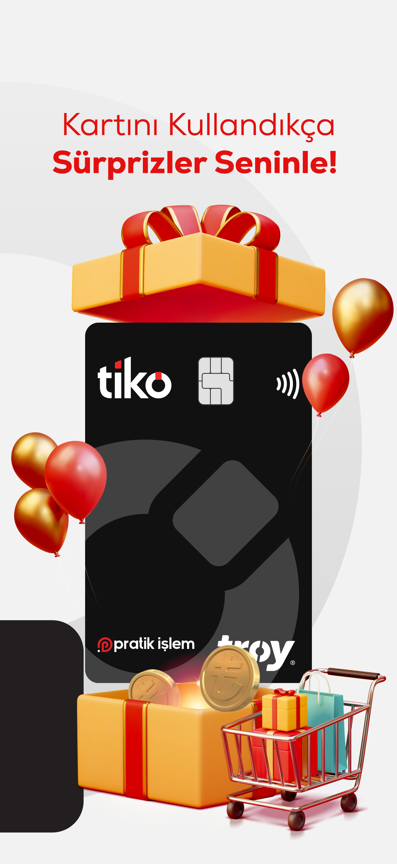 Tiko Sanal Kart ile online alışverişlerde anında ödeme yapabilir, Tiko Fiziksel Kart ile mağaza içi temassız alışverişlerini güvenle gerçekleştirebilirsin. Üstelik anlaşmalı markalarda harcadıkça kazandıran cashback fırsatlarını da kaçırma.